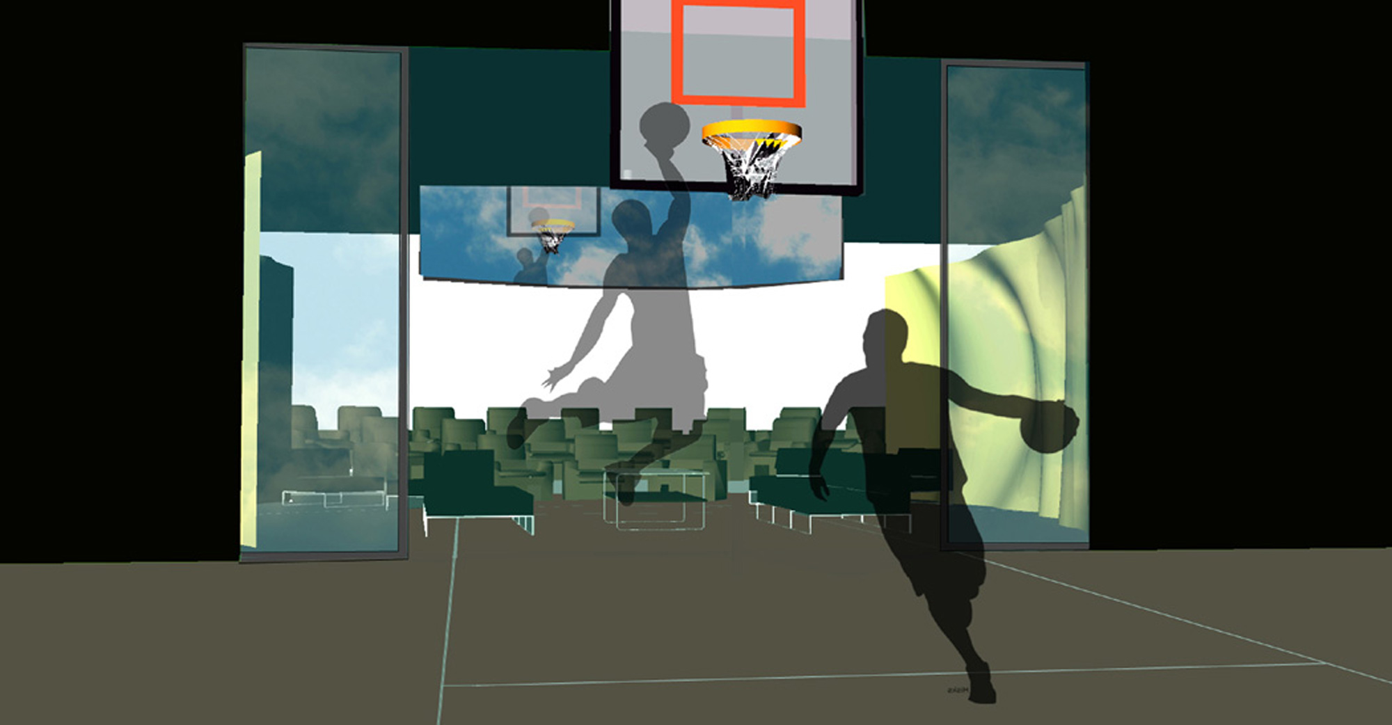 This project was a concept for a media company's new studio. The main clients were top roster Lakers players, so the design was generated as an inside-outside courtyard that doubled as a viewing room for basketball 'footage' and a small scale basketball court. The theater was set up to simultaneously view the virtual games on the media screens and actual one-on-one games taking place in the 'court'.
